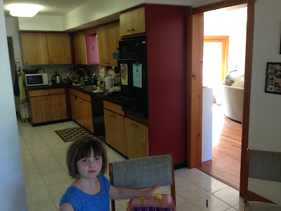 As you enter the breakfast nook and turn to the left, you face our kitchen. It is just the right size for me. The girls like sneaking up quickly between the knife I'm wielding and the produce I'm cutting. Akiva has a special drawer full of serving utensils that he frequents.