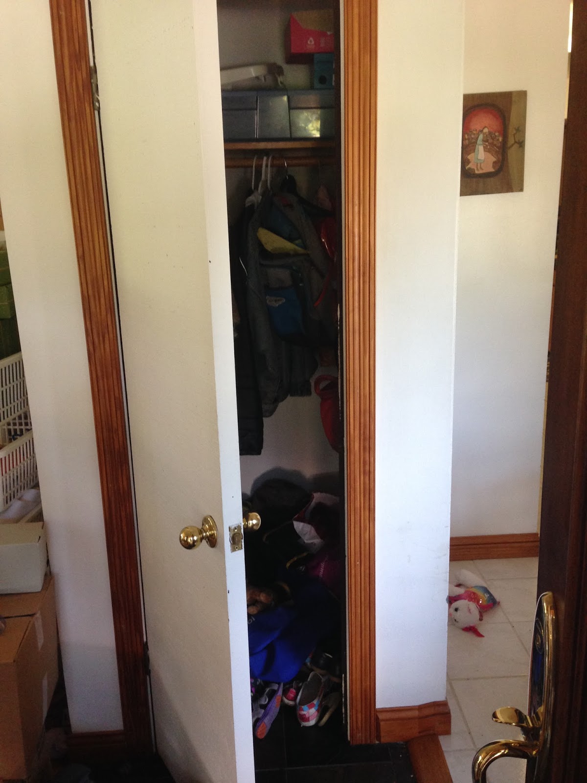 So, walk in this front door with me. There's a closet immediately in front of it. Judith stole the shoe rack to make a home for her stuffed animals so all the shoes are just jumbled together on the floor. The door to the closet is usually open.