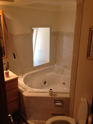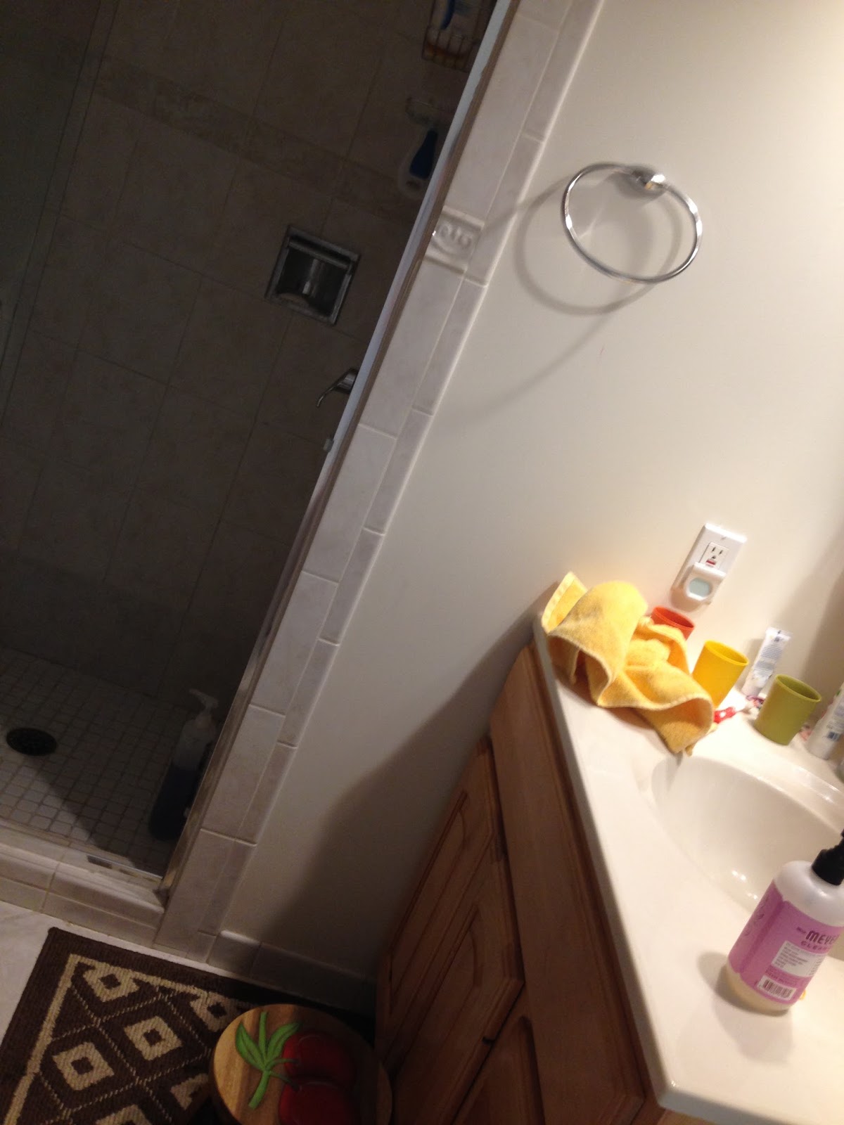 There is a shower tucked in behind the door, with a good shower head. Crucial, in my book. That hand towel is never actually hanging from the towel rack. Notice anything missing? There are no other towel racks in this bathroom. I'm totally puzzled regarding where the previous owners dried out their towels. We use an old laundry rack in our giant bedroom and the doorknobs of the kids' rooms. So weird. We'll make a trip to IKEA eventually to fix this.