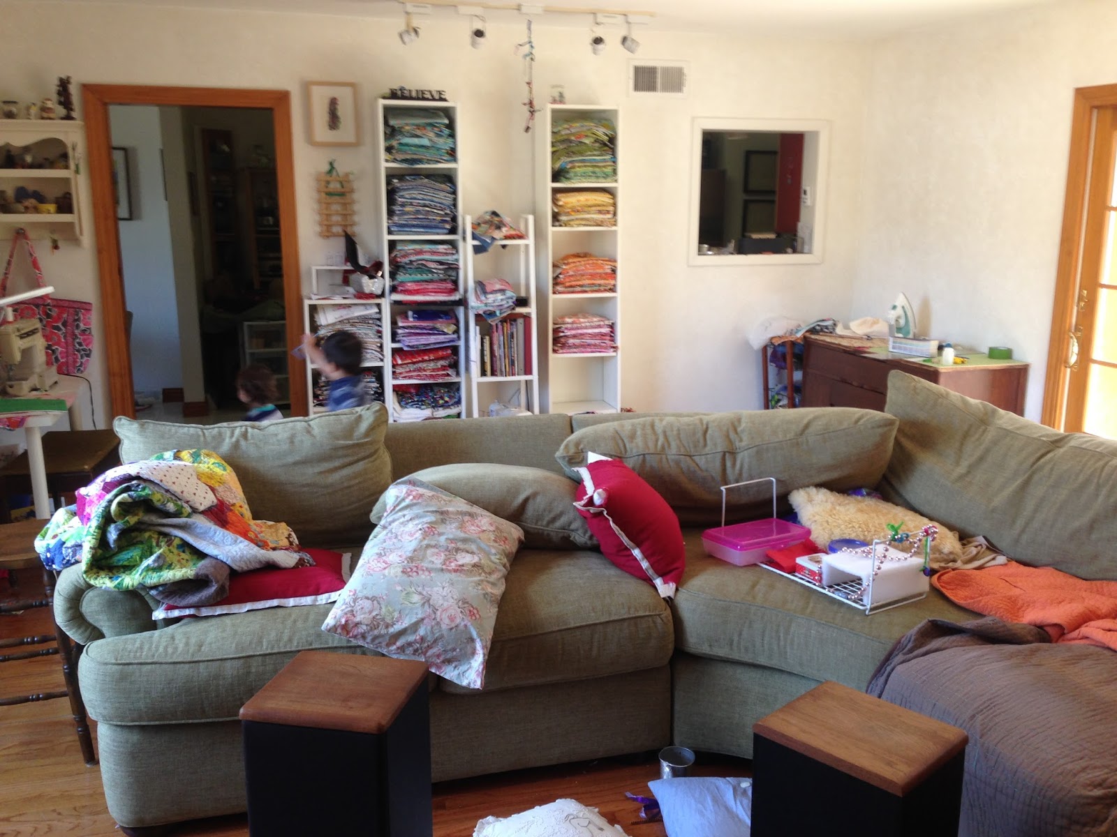 As you can see, it has a swinging woodstove and tons of natural light. The whole house is full of light, which was part of why I loved it. My quilting studio takes up a third of the room. I try to create a little every day to maintain spiritual balance. I could not accomplish this if my workspace was away from where the kids spend their time.