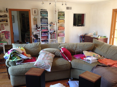 This couch was a gift from a friend when the company sent them a brand-new couch to replace this one when it had a totally hidden marker stain, which triggered its warrantee. Could it be more perfect for the space? That's one of my quilts hanging on the wall.