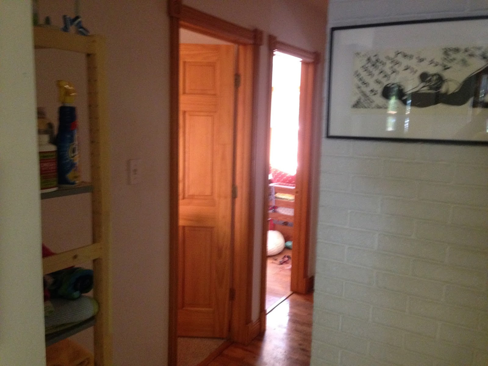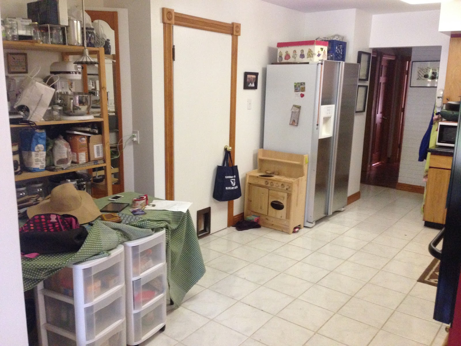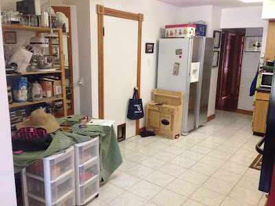 On your left, you'll see our make-shift pantry and the door to the basement.